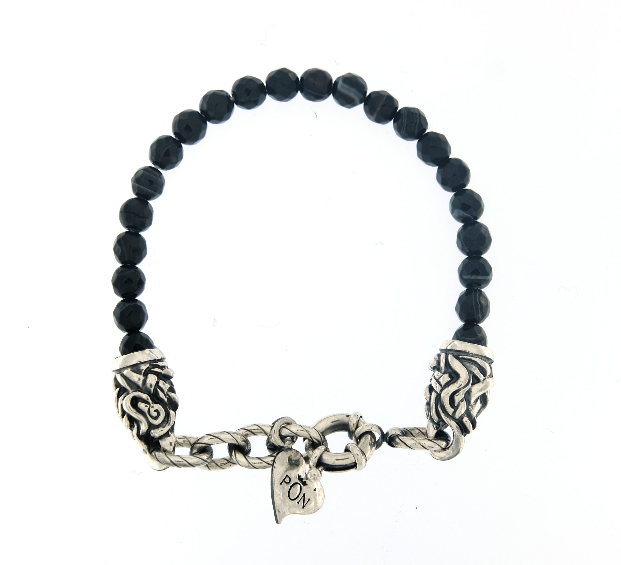 Bracciale Portonovo Giro Singolo Nero Latino. Realizzato in lega metallica con finitura argento, composto da pietre di agata striata e finitura in argento vintage. Ogni singolo componente di questo gioiello viene prodotto e assemblato manualmente da manodopera italiana rendendo ogni creazione un pezzo unico e irripetibile.