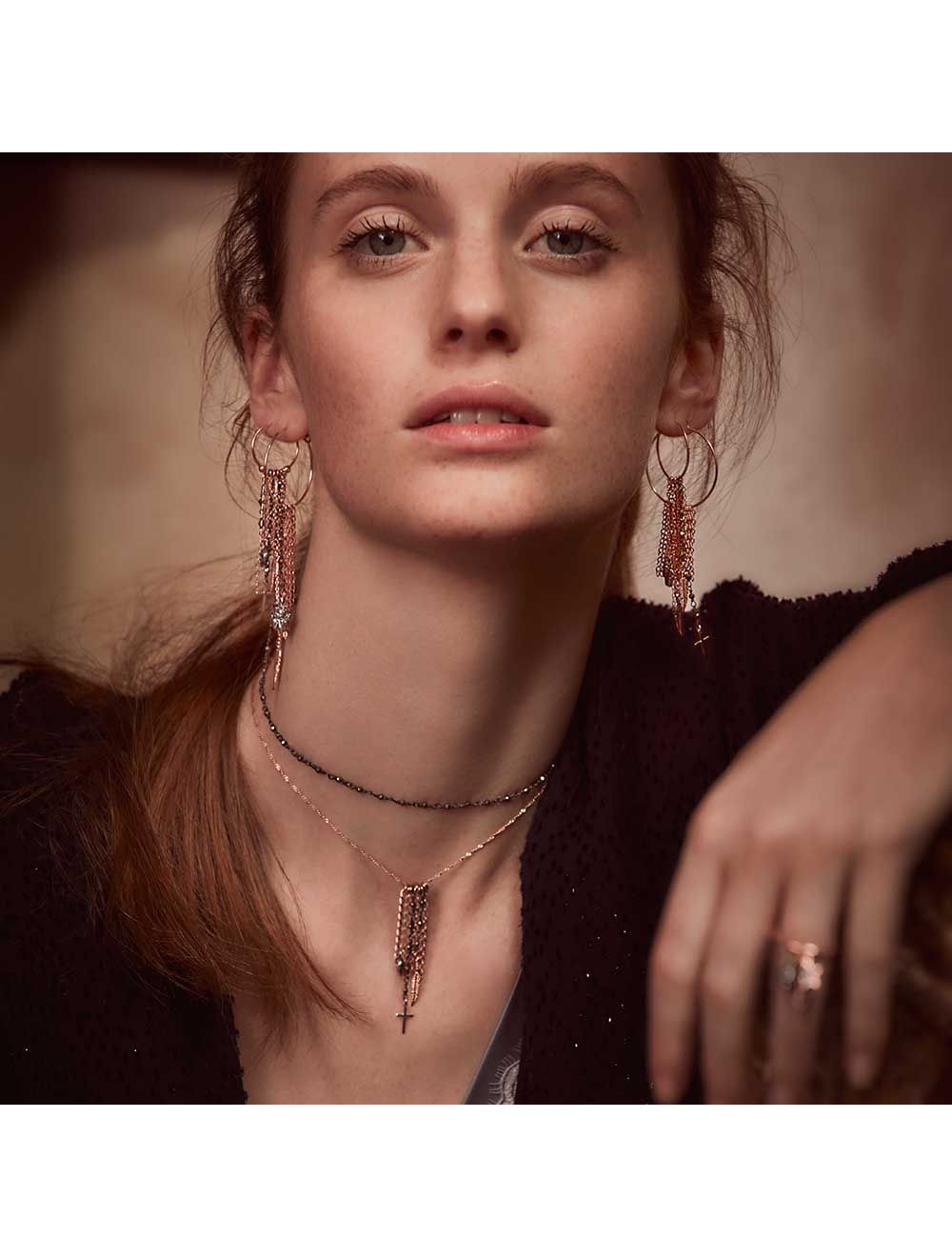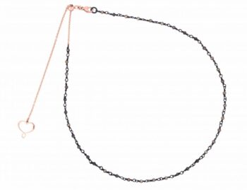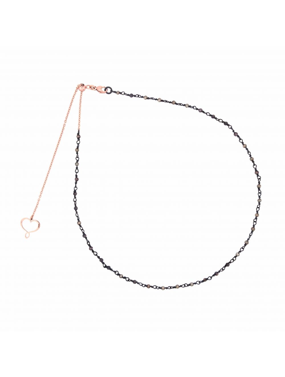Chocker di catena, con rosario di Pirite. Realizzato in argento 925 con placcatura in oro rosa ad alto spessore e ad alta resistenza. La circonferenza può essere regolata da un minimo di 30 cm fino ad un massimo di 40 cm grazie alla sfera scorrevole. Può essere indossato anche come chocker. Chiusura a moschettone.