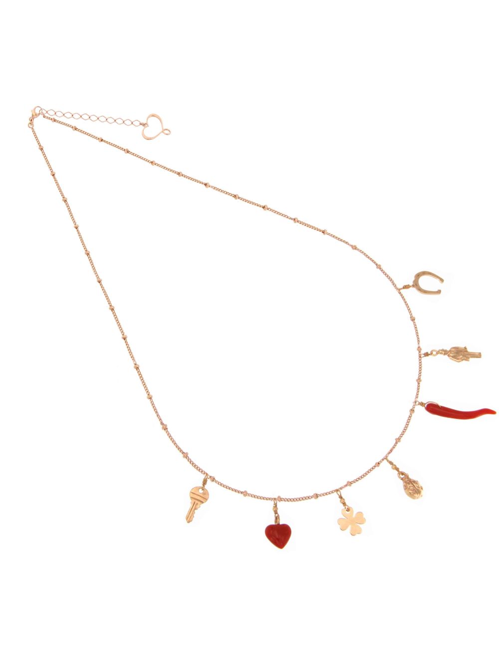 Girocollo fortune e coralli realizzato in argento 925 con galvanica oro rosa. Sono presenti sette elementi pendenti fra cui: una chiave, un cuore in corallo, un quadrifoglio, una coccinella, un corno in corallo, un gobbo e un ferro di cavallo. Il girocollo può essere regolato da 41,5 fino a 51 cm. Può essere indossato come chocker. Chiusura a moschettonE
