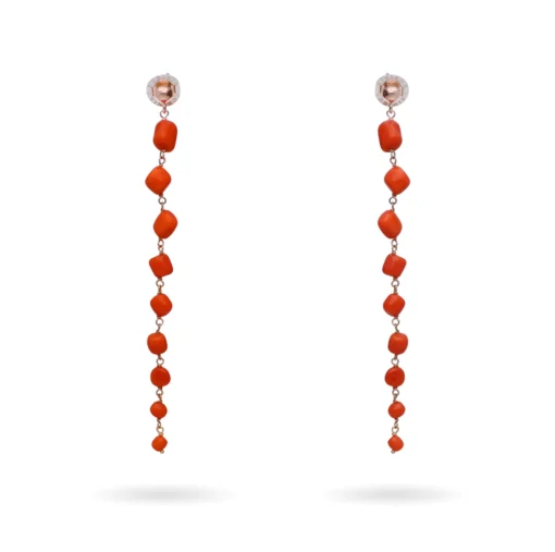 Orecchini pendenti da 9cm con sassolini in corallo ammagliati in Oro Rosa 9kt.