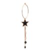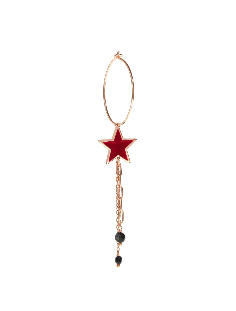 Orecchino singolo a cerchio medio, misura 25 mm di diametro, realizzato in argento 925 placcato in oro rosa ad alto spessore ed alta resistenza. Il pendente è composto da una stella a cattedrale di 15 mm con smalto a cattedrale rosso, tre tipologie di catene diverse e due piccole sfere di Spinelli. La lunghezza totale è di 8, 5 cm.